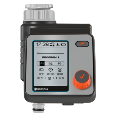 Με τον Προγραμματιστή Μπαταρίας Master της GARDENA, το πότισμα μπορεί να προγραμματιστεί με ευελιξία και ανάλογα με τις ανάγκες της κάθε περιοχής. Μπορούν να δημιουργηθούν έως και έξι διαφορετικοί και ανεξάρτητοι κύκλοι ποτίσματος. Ο προγραμματιστής λειτουργεί με μπαταρία, συνδέεται απευθείας με τη βρύση και λειτουργεί εύκολα χρησιμοποιώντας μόνο έναν διακόπτη, ο οποίος περιστρέφεται για την επιλογή των δεδομένων και πιέζεται για την επιβεβαίωση. Μια ευανάγνωστη οθόνη γραφικών LCD δείχνει όλες τις ρυθμίσεις με μια ματιά. Το μενού μπορεί να επιλεγεί σε 10 γλώσσες. Η μονάδα προστασίας από τις καιρικές συνθήκες μπορεί να αφαιρεθεί. Είναι εύκολο να προσαρμόσετε κεντρικά τη διάρκεια του ποτίσματος ή να διακόψετε όλα τα ποτίσματα στην περίπτωση κακών καιρικών συνθηκών. Η μονάδα είναι ιδανική για τον έλεγχο του Αυτόματου Διανομέα Ποτίσματος GARDENA. Ο Προγραμματιστής Μπαταρίας Master μπορεί επίσης να χρησιμοποιηθεί σε συνδυασμό με ένα Υγρασιόμετρο GARDENA.
